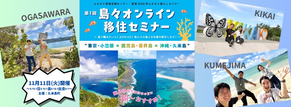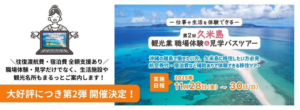 しごと 住まい くらし 移住をご検討中の方へ TOP しごと 住まい くらし 久米島町の紹介 移住をご検討中の方へ 島ぐらしコンシェルジュ 関連HP・ブログリンク集 まちづくり 移住相談・お問い合わせ 更新情報 求人 非常勤職員 【久米島町社会福祉協議会】事務業務の担当職員を募集しています! 求人 会計年度任用職員 【地域おこし協力隊】令和7年度 まなびやコーディネーター(中学校学習支援員)を追加募集します! 求人 会計年度任用職員 【地域おこし協力隊】令和7年度 学生寮ハウスマスターを追加募集します! 求人 アルバイト パート 正社員 【ピータイム久米島】ホールスタッフ募集 レポート 仲原家休館のお知らせ もっと見る お知らせ 【申込終了】11月28日(金)〜11月30日(日)\全国どこからでも渡航費支援あり/「第2回 久米島観光業職場体験&見学バスツアー」参加者大募集! 10月12日(日)「おきなわ移住・就職相談会 in 名古屋」に出展! 10月11日(土)「いい街発見!地方の暮らしフェア2025」に出展! 10月11日(土)しまんちゅの会「茶話会」はお休みします 11月11日(火)\離島好きに超おすすめ!/東京・小笠原✕鹿児島・喜界島✕沖縄・久米島 第一回島々オンライン移住セミナーを開催します! もっと見る 仲原家カレンダー 仲原家の開館情報及び、イベントの予定を公開しております。 火曜〜土曜 9:00〜12:00 13:00〜16:00(水曜のみ午前閉館) 仲原家の開館情報及び、イベントの予定を公開しております 火曜〜土曜 9:00〜12:00 13:00〜16:00(水曜のみ午前閉館) 島ぐらしコンシェルジュとは 先輩移住者インタビュー(動画) 移住希望会員登録 久米島町について 久米島 島くらしコンシェルジュ Facebook 久米島 島ぐらしコンシェルジュ - 移住定住に関する相談窓口